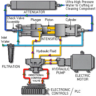 آب بعد از تصفيه شدن با پمپ در فشارهای بالا و پس از تشديد شدن فشار و رسيدن به فشار فوق العاده بالا به خطوط انتقال جريان مي رسد که اغلب لوله هاي ضخيم فولادی از جنس ضد زنگ می باشند. سپس در يک کلگي در يک لوله که قطر آن نسبت به طولش ناچيز است جريان يکنواختی ايجاد مي شود که اين قطعه نازل ( nozzle ) نام دارد .  آب پس از عبور از نازل به قطعه نسبتا کوچکي به نام اريفيس ( orifice ) که بسيار سخت بوده و دارای سوراخ بسيار ريزی مي باشد مي رسد . آب پس از عبور از اين قطعه با سرعت بسيار بالا از سيستم خارج شده و به سوی قطعه پرتاب مي شود . نيروی حاصل از انرژی جنبشی و فشار بالا باعث مي شود که آب بتواند در قطعه ترک هايي ايجاد کرده و يا بصورت مستقيم از قطعه کار براده برداری کند و باعث سوراخکاری و يا ماشين کاری قطعه شود .